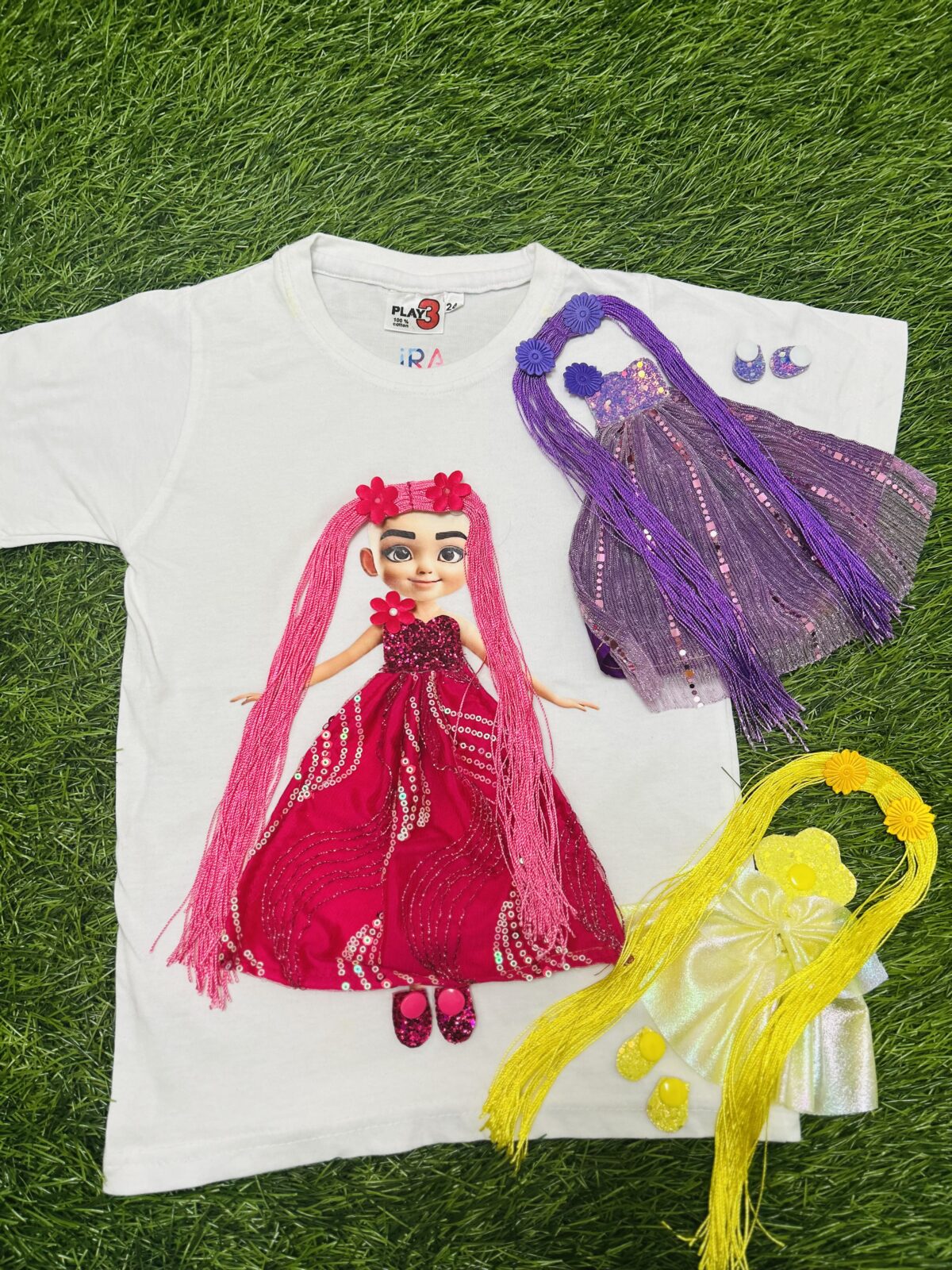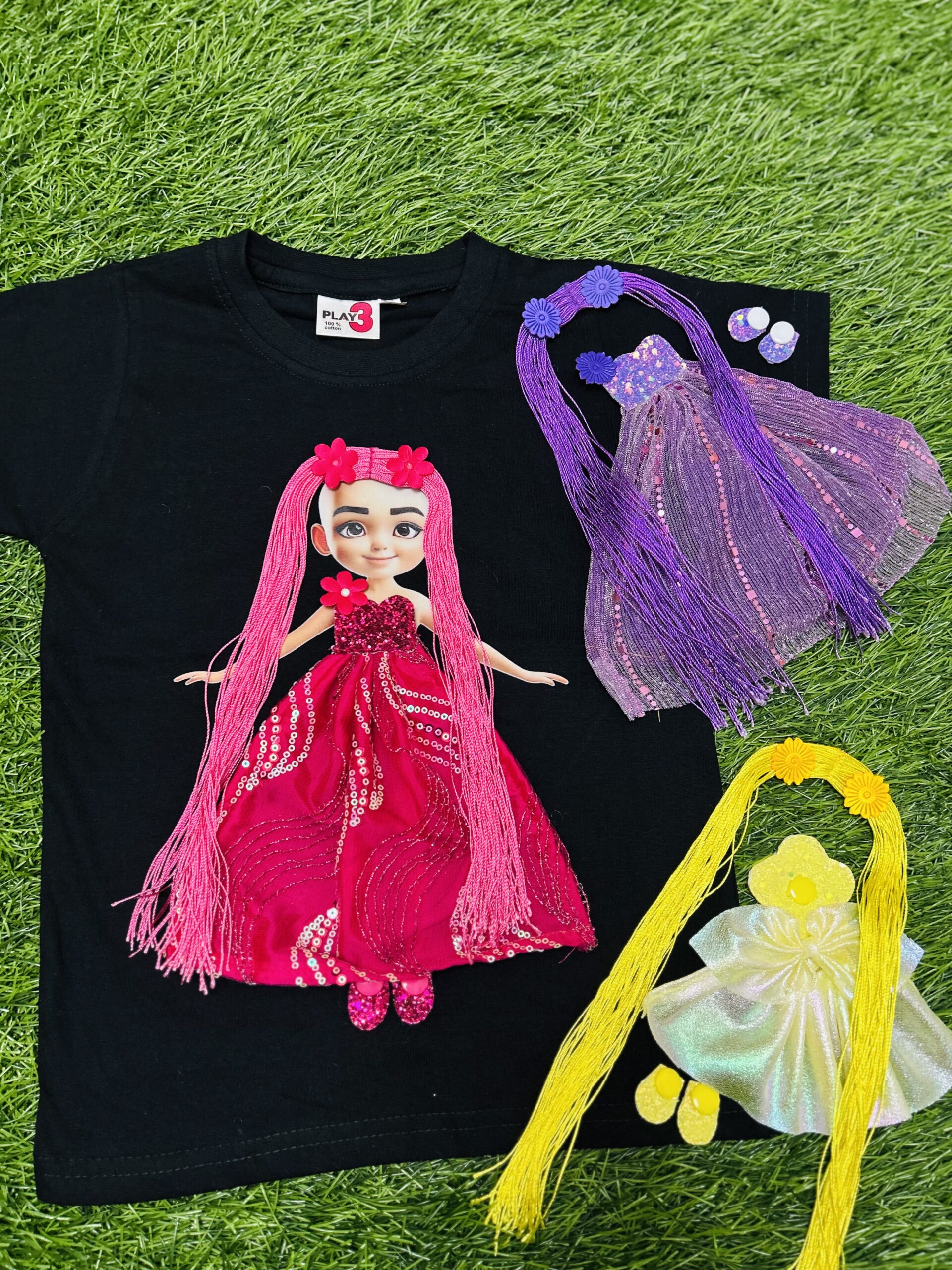 1 Doll Print T-shirt + 3 Interchangeable Doll Dresses + 3 Hairstyles + 3 Pairs of Shoes