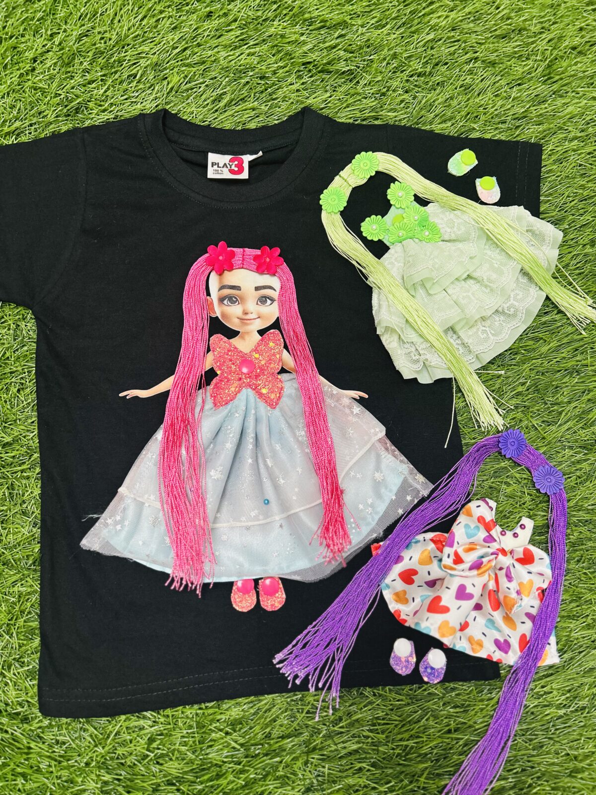 1 Doll Print T-shirt + 3 Interchangeable Doll Dresses + 3 Hairstyles + 3 Pairs of Shoes