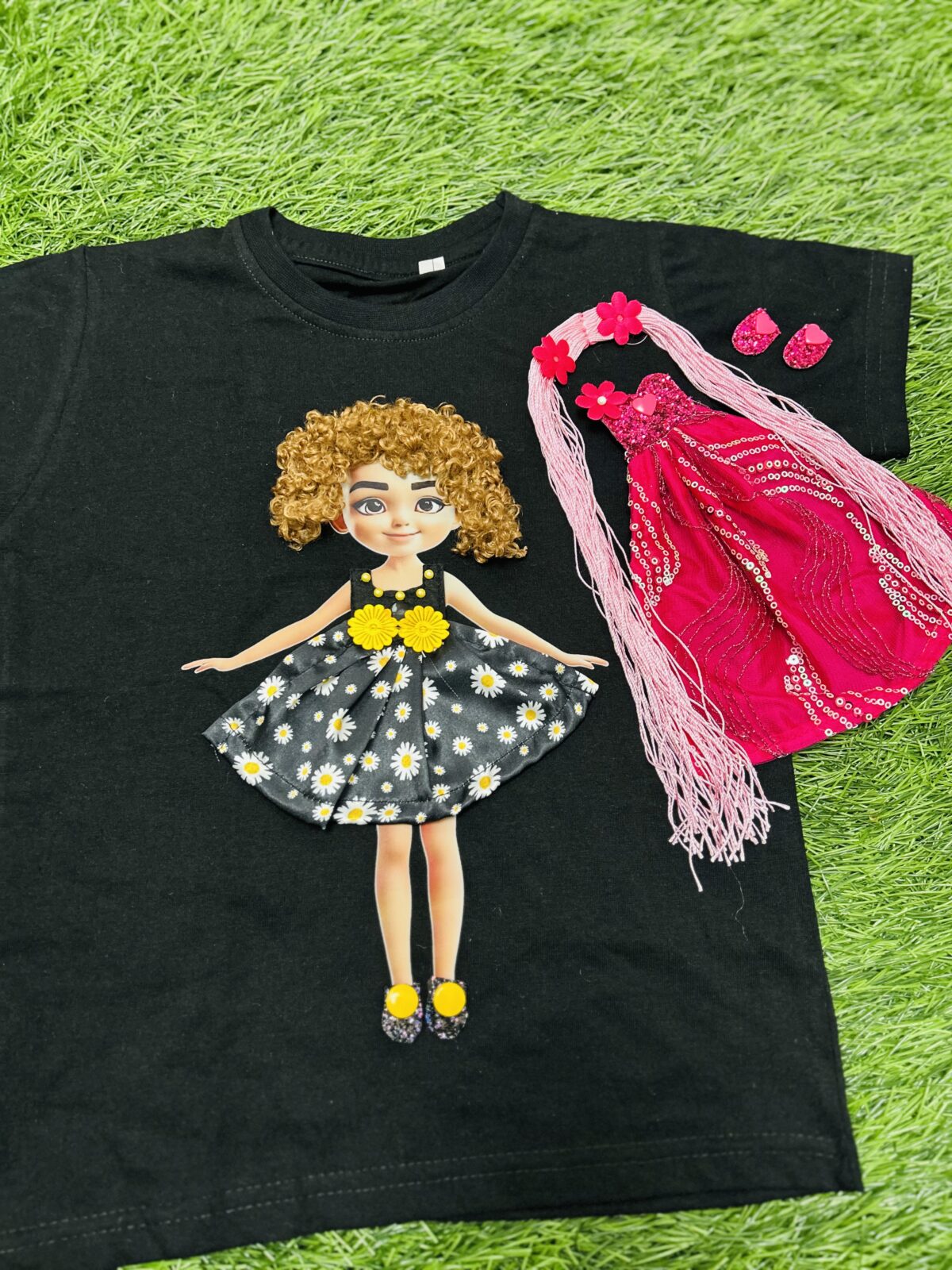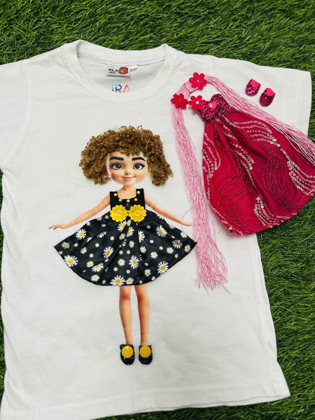 • Combo Includes: 1 T-shirt + 2 Doll Dresses + 2 Doll Hair Styles + 2 Pairs of Shoes