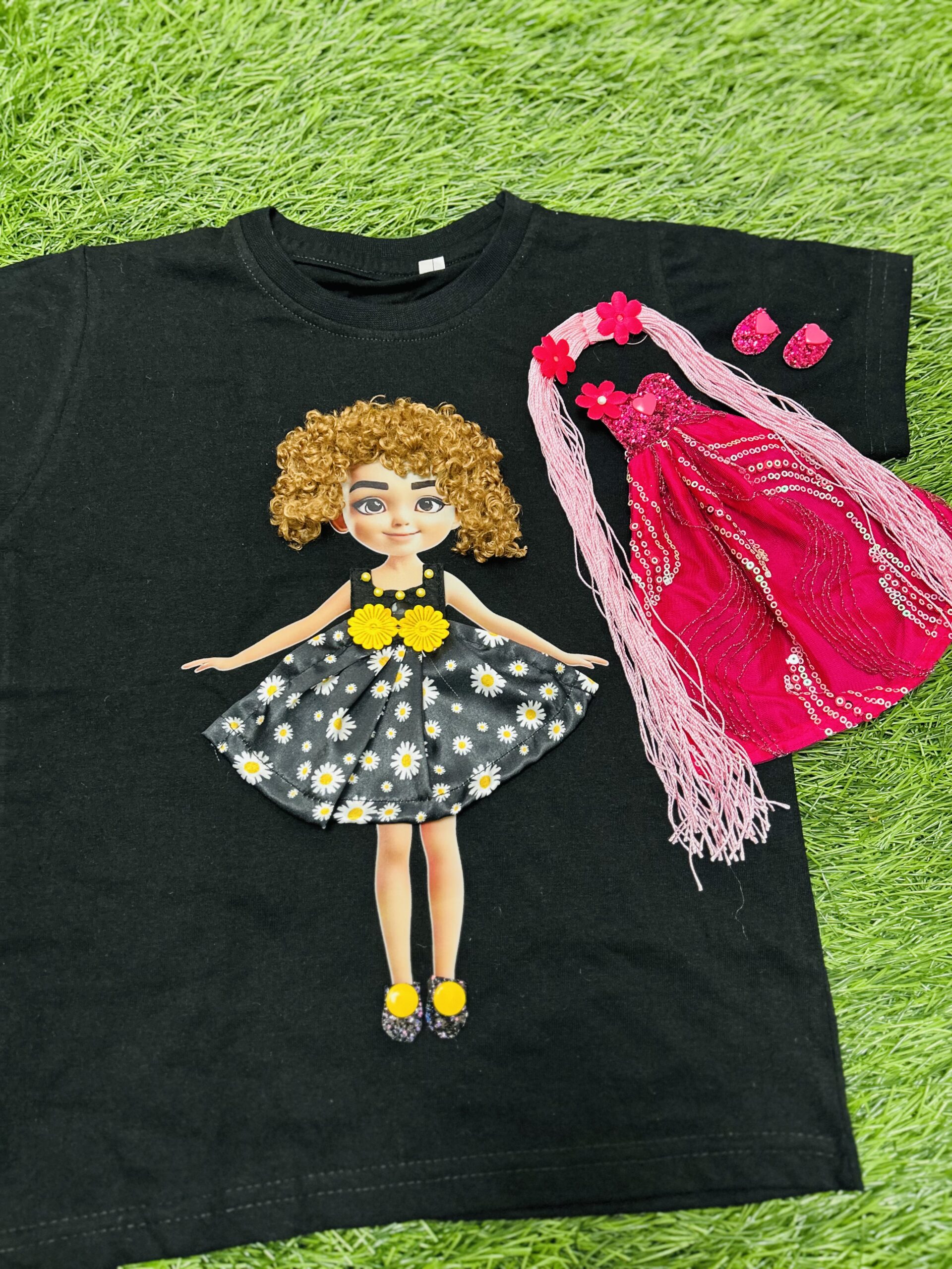 Step into a world of sparkle and style with the Twisty & Flowy Hair Magic Combo! This adorable T-shirt features a cute doll print that your little one can style with interchangeable accessories. The combo includes two doll dress-up sets — one with twisty curls and a glitter short dress, and the other with flowy long hair and a shimmering gown. Each comes with matching shoes for the perfect fairy-tale finish.