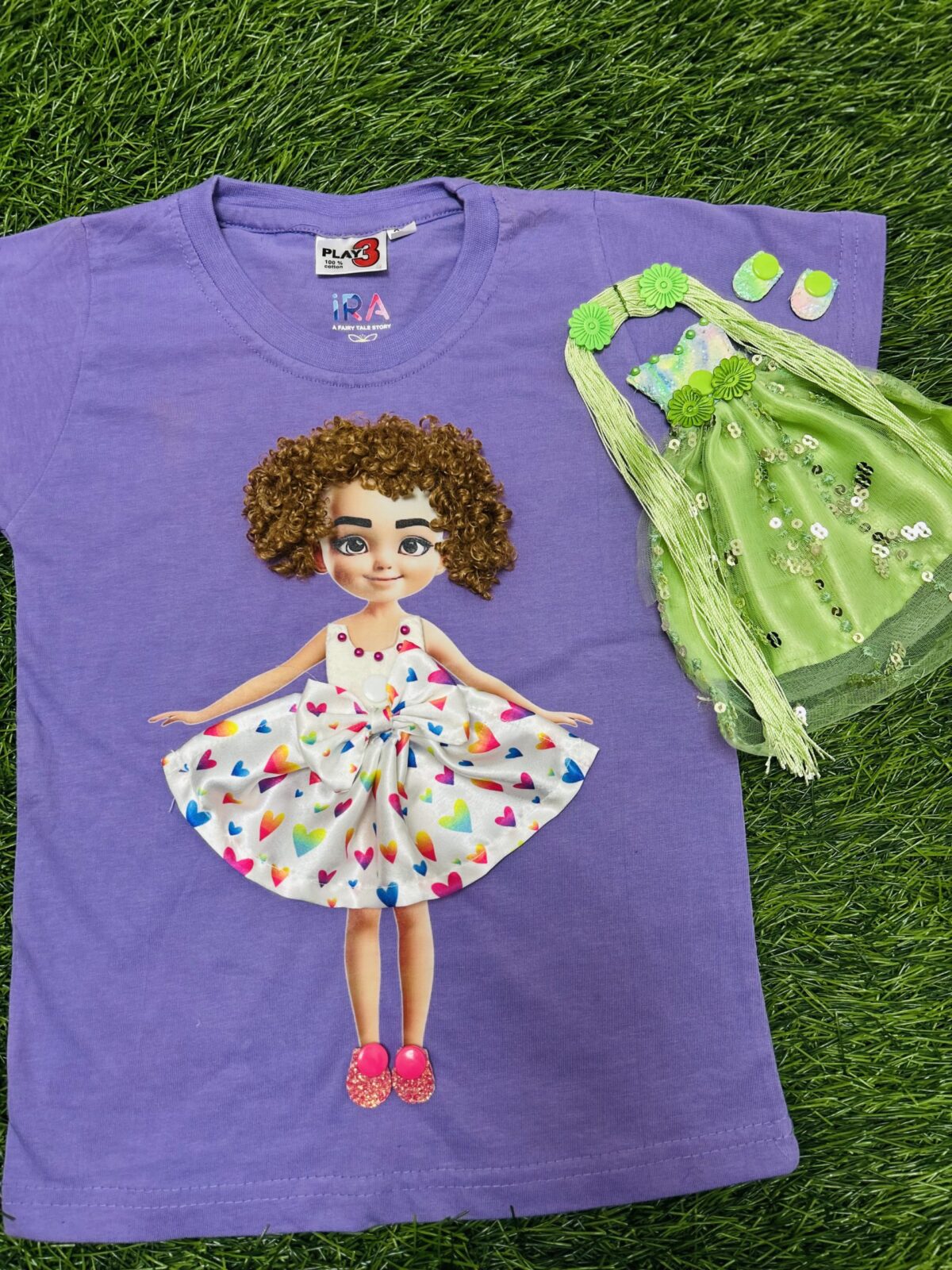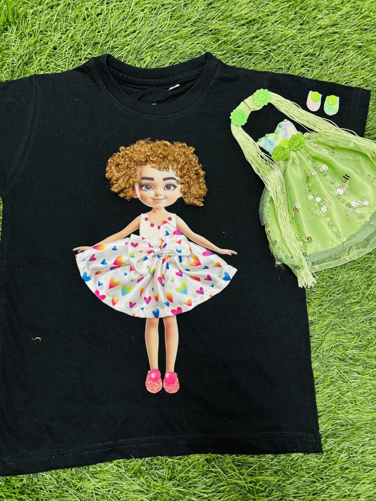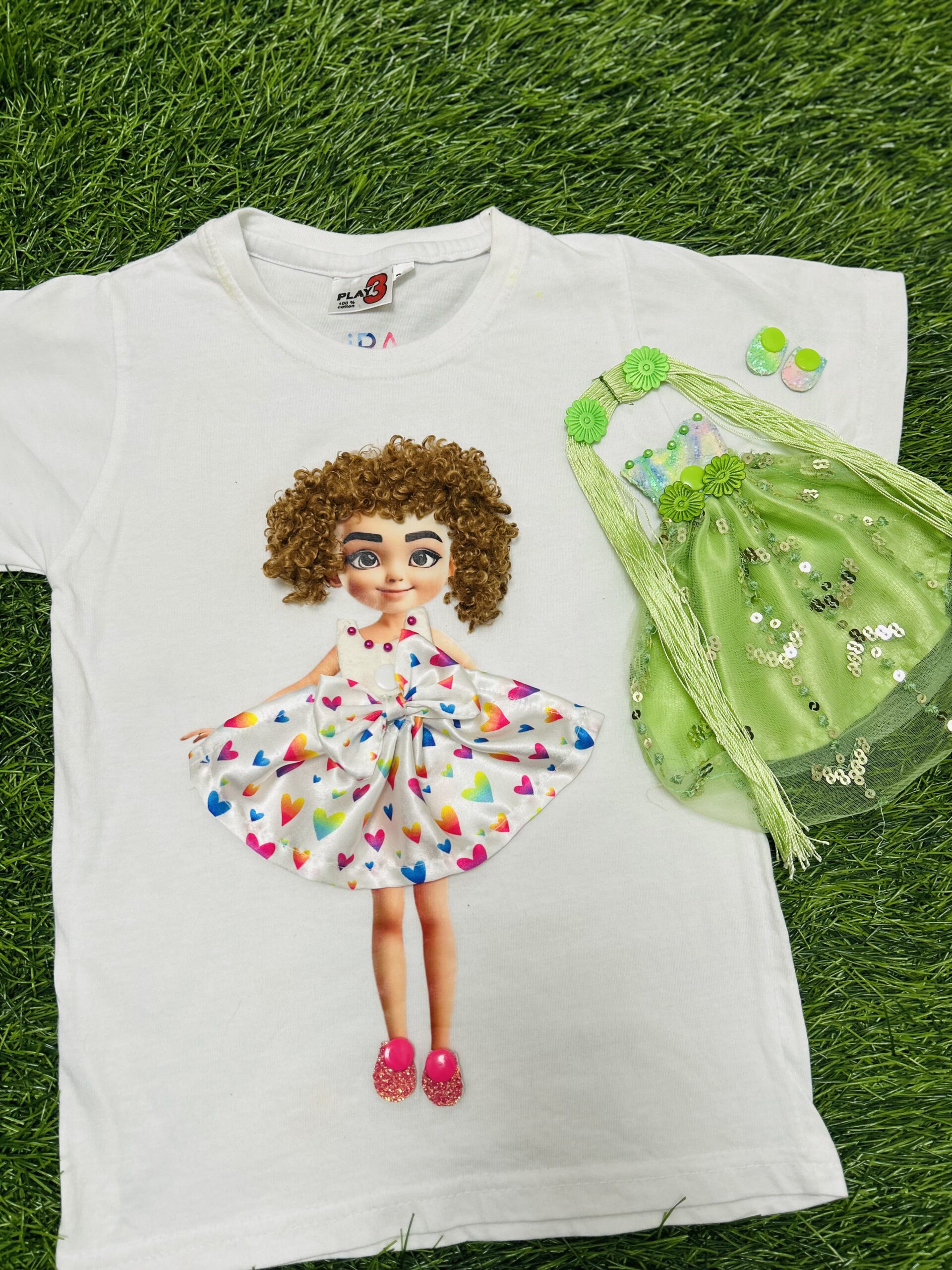 • Combo Includes: 1 T-shirt + 2 Doll Dresses + 2 Doll Hair Styles + 2 Pairs of Shoes