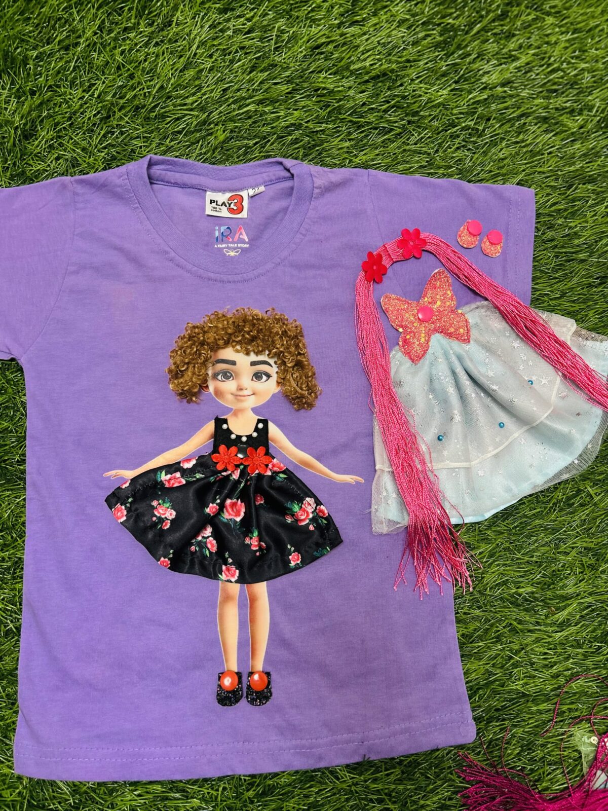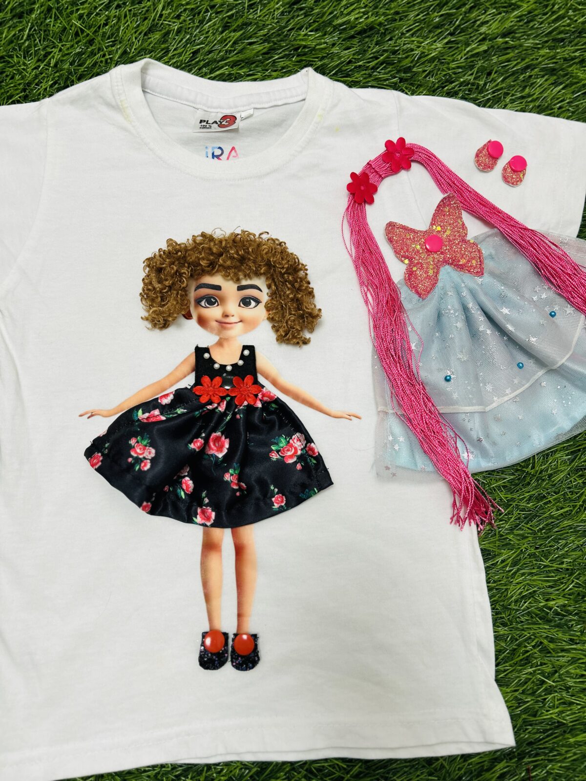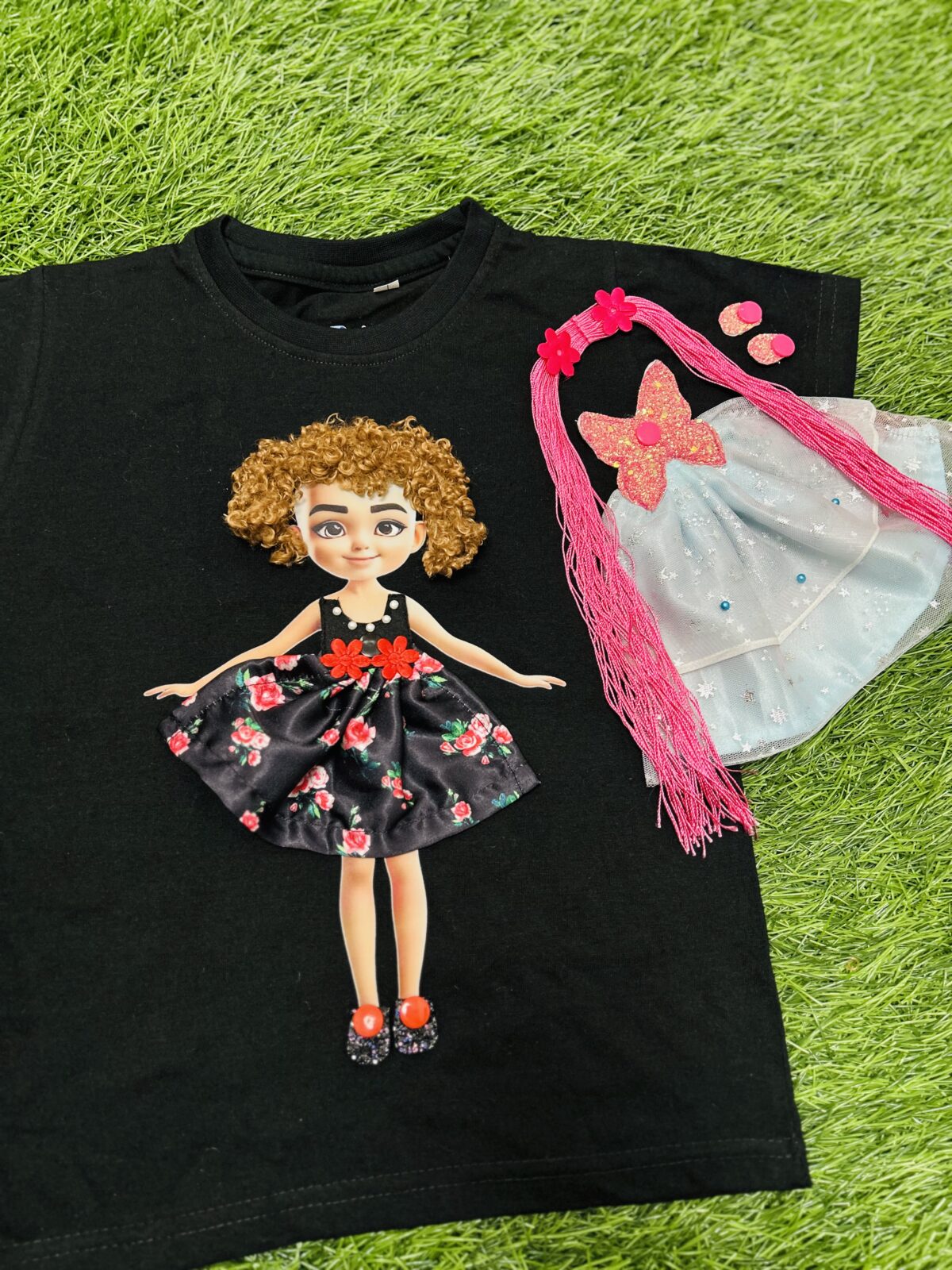 • Combo Includes: 1 T-shirt + 2 Doll Dresses + 2 Doll Hair Styles + 2 Pairs of Shoes