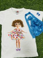 Step into a world of sparkle and style with the Twisty & Flowy Hair Magic Combo! This adorable T-shirt features a cute doll print that your little one can style with interchangeable accessories. The combo includes two doll dress-up sets — one with twisty curls and a glitter short dress, and the other with flowy long hair and a shimmering gown. Each comes with matching shoes for the perfect fairy-tale finish.